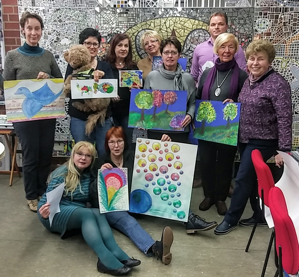 Am Samstag, den 23. März 2019 kamen acht Kunstinteressierte zusammen, um bei einem Oasentag in Räumen der Kunstschule ihrer Kreativität Zeit und Raum zu geben. Unter den Teilnehmern war auch dieses mal Frau Göllner, die uns als Verein schon seit Jahren unterstützt. Unsere Kunstpädagogin Lilia Gavrilenko überreichte Fr. Göllner eine Dokumentationsmappe über Erweiterung des Kunstschulangebots im ländlichen Raum und bedankte sich herzlich für die fortwährende Unterstützung. Nach einem Sektempfang konnten die Teilnehmer in lockerer Atmosphäre verschiedene Techniken, wie Aquarell, Goache und zeichnen, unter der fachkundigen Anleitung von Frau Gavrilenko ausprobieren. Dabei erhielten sie wertvolle sowie praktische Tipps. Für leibliches Wohlergehen der Anwesenden, hat sich wie immer Fr. Helga Knoche-Harrjes gekümmert und die Teilnehmer haben sich das leckere Mittagessen sowie Kaffee und Kuchen schmecken lassen. So erlebten alle einen unvergeßlichen Tag und wollen gemeinsam am 29. Juni 2019 an dem nächsten Oasentag teilnehmen.
