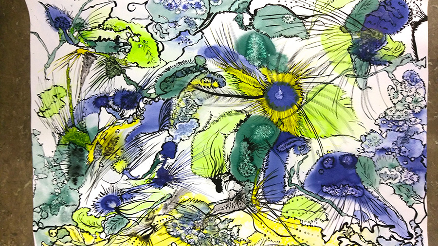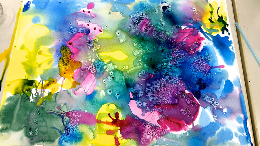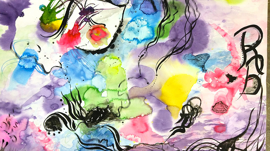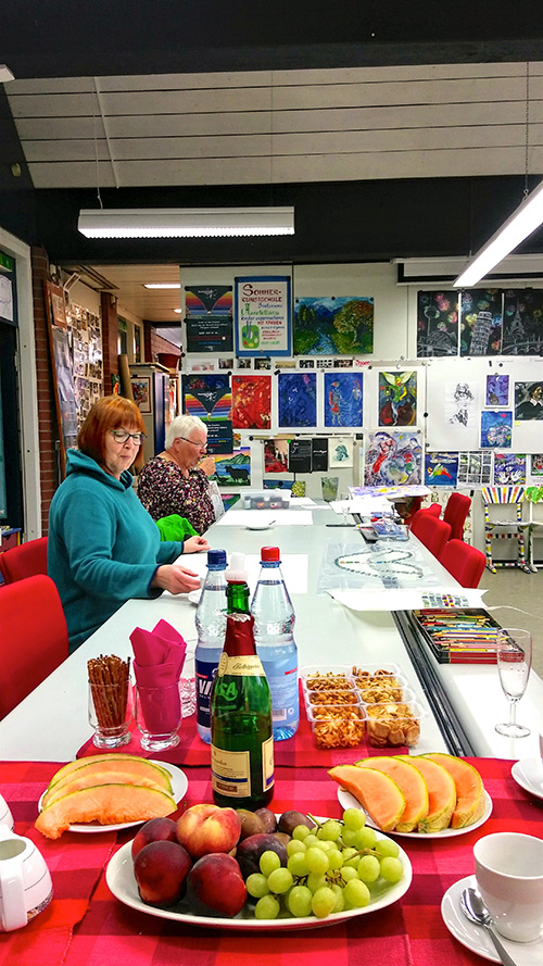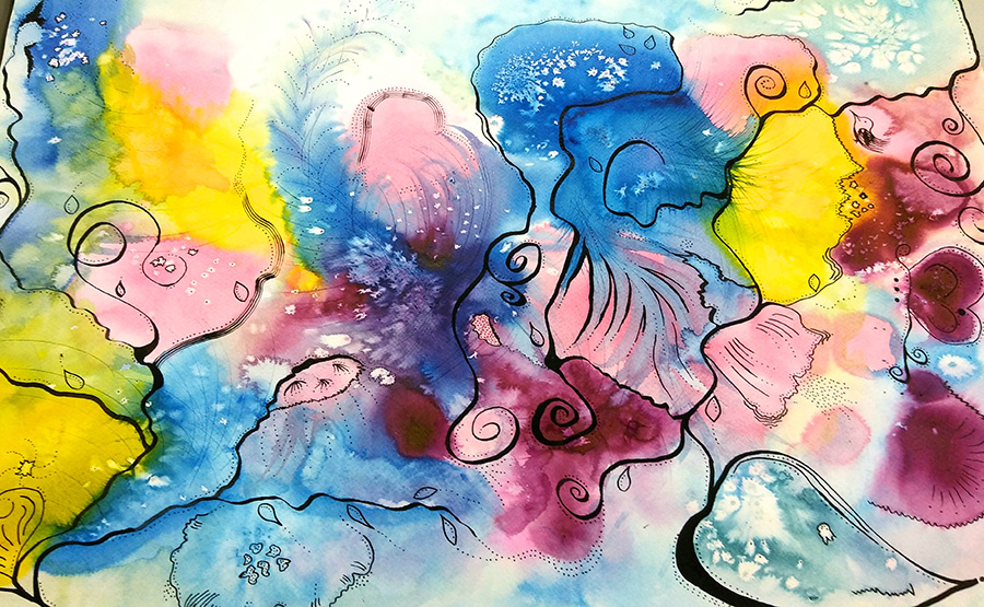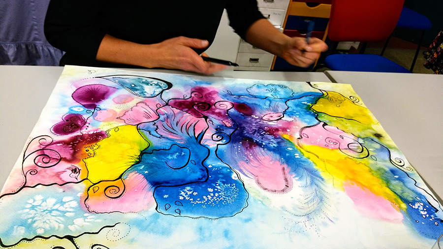 Mit einem Glas Sekt oder Orangensaft begrüßte Lilia Gavrilenko die TeilnehmerInnen zu einem weiteren Oasentag am 12. August 2017. Anschließend wurden die Wünsche und Vorstellungen der TeilnehmerInnen ausgetauscht und - wenn gewünscht - mit Hilfe der Beratung von Lilia umgesetzt. Mittags gab es Gelegenheit zu einem Imbiss, um neue Energien zu tanken. Ein Getränkebuffet mit Wasser, Säften, Kaffee,Tee und Leckereien stand bereit. In ganz unterschiedlichen grafischen Techniken probierten sich die Anwesenden aus: Kombinationen von Farben und Tusche; Harmonisierung von Farbflächen und Linien (Federzeichnung mit Chinesischer Tusche nass-in-nass sowie trocken und mit Wasserfarben). Dankbar über dieses farbenfrohe Beisammensein verließen die TeilnehmerInnen das Atelier.