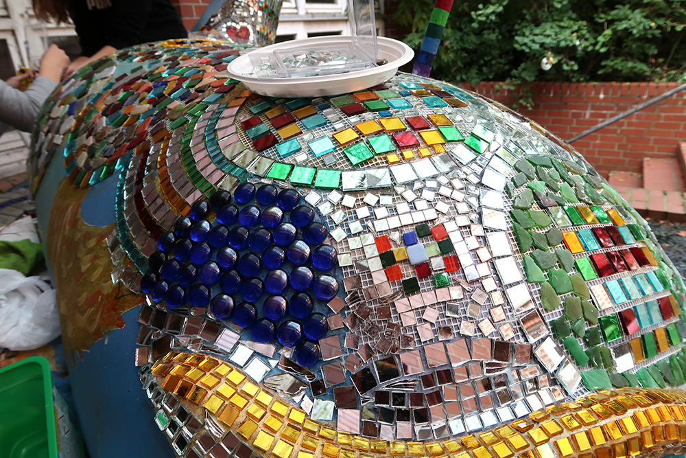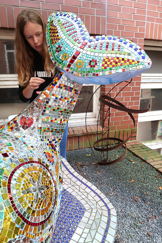 Hier sehen Sie Kunstschülerinnen bei letzten Montagearbeiten am Objekt.
