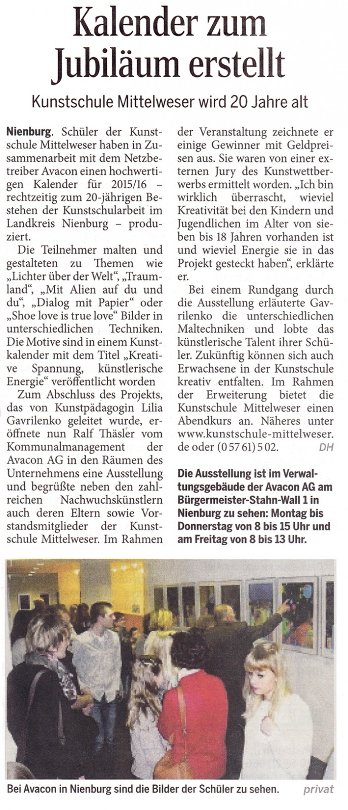 Die Kunstschule Mittelweser im Landkreis Nienburg/Weser im Blick der Presse. Eine Auswahl von Berichten zu unseren Projekten, Veranstaltungen und Aktivitäten zeigen wir Ihnen hier. Ein sehr ausführliches Pressearchiv befindet sich bei uns in der Kunstschule Mittelweser im Landkreis Nienburg/Weser und darf bei Interesse gerne eingesehen werden.