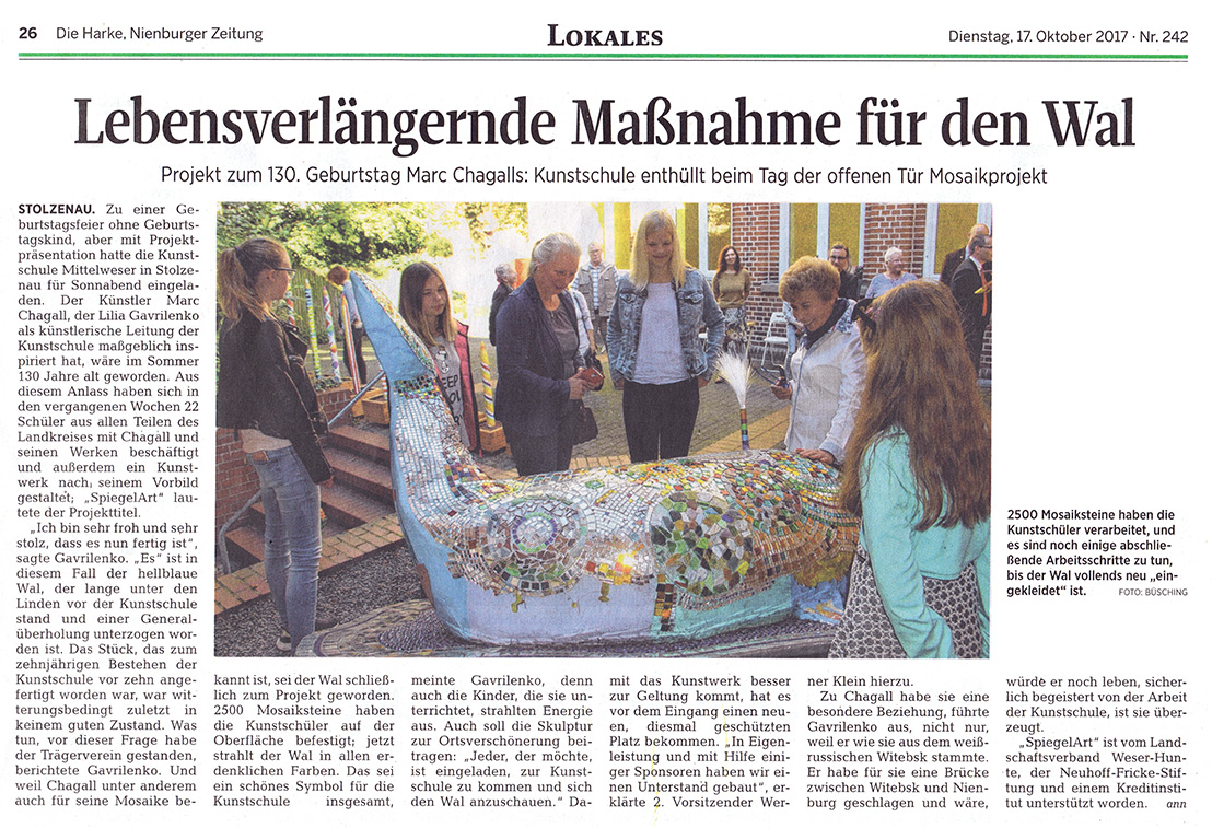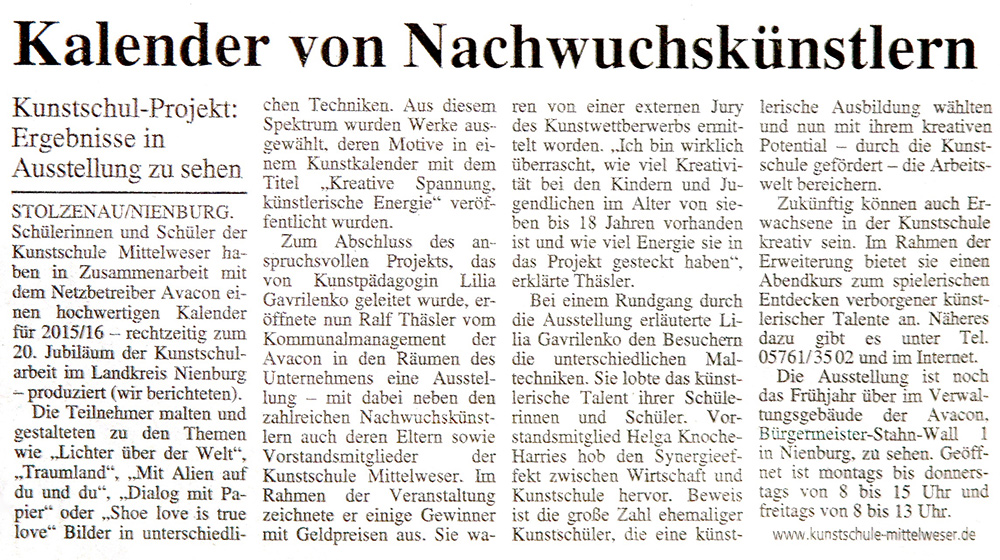 Die Kunstschule Mittelweser im Landkreis Nienburg/Weser im Blick der Presse. Eine Auswahl von Berichten zu unseren Projekten, Veranstaltungen und Aktivitäten zeigen wir Ihnen hier. Ein sehr ausführliches Pressearchiv befindet sich bei uns in der Kunstschule Mittelweser im Landkreis Nienburg/Weser und darf bei Interesse gerne eingesehen werden.