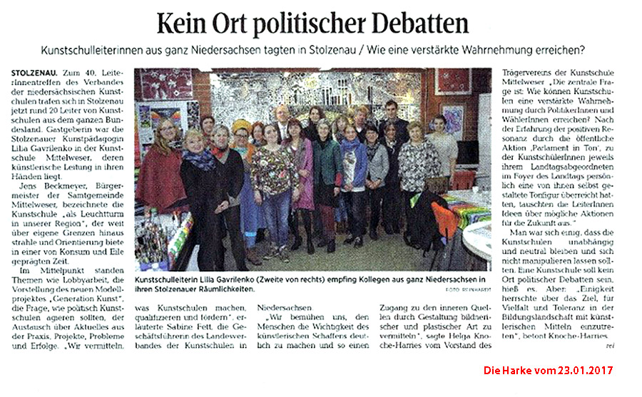 „Wir bemühen uns, den Menschen die Wichtigkeit des künstlerischen Schaffens deutlich zu machen und so einen Zugang zu den inneren Quellen durch Gestaltung bildnerischer und plastischer Art zu vermitteln“, sagte Helga Knoche-Harries vom Vorstand des Trägervereins der Kunstschule Mittelweser. „Die zentrale Frage ist: Wie können Kunstschulen eine verstärkte Wahrnehmung durch PolitikerInnen und WählerInnen erreichen? Nach der Erfahrung der positiven Resonanz durch die öffentliche Aktion „Parlament in Ton“, zu der KunstschülerInnen jeweils ihrem Landtagsabgeordneten im Foyer des Landtags persönlich einen von ihnen selbst gestaltete Tonfigur überreicht hatten, tauschten die LeiterInnen Ideen über mögliche Aktionen für die Zukunft aus.“